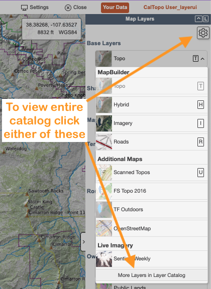 CalTopo provides a wide range of base layers and overlays, from general-purpose maps to highly specialized options. To make it easier to find what you need, these are organized in a catalog where you can choose which layers and overlays to include in your personalized menu. When you first open the Map Layers, the Base Layer and Overlay menus start with a default selection of our most popular and generally useful layers. Although you can hide certain layers and overlays, you can always unhide them later if you want to use them. We recommend taking time to explore the full catalog and customize it to best suit your needs.