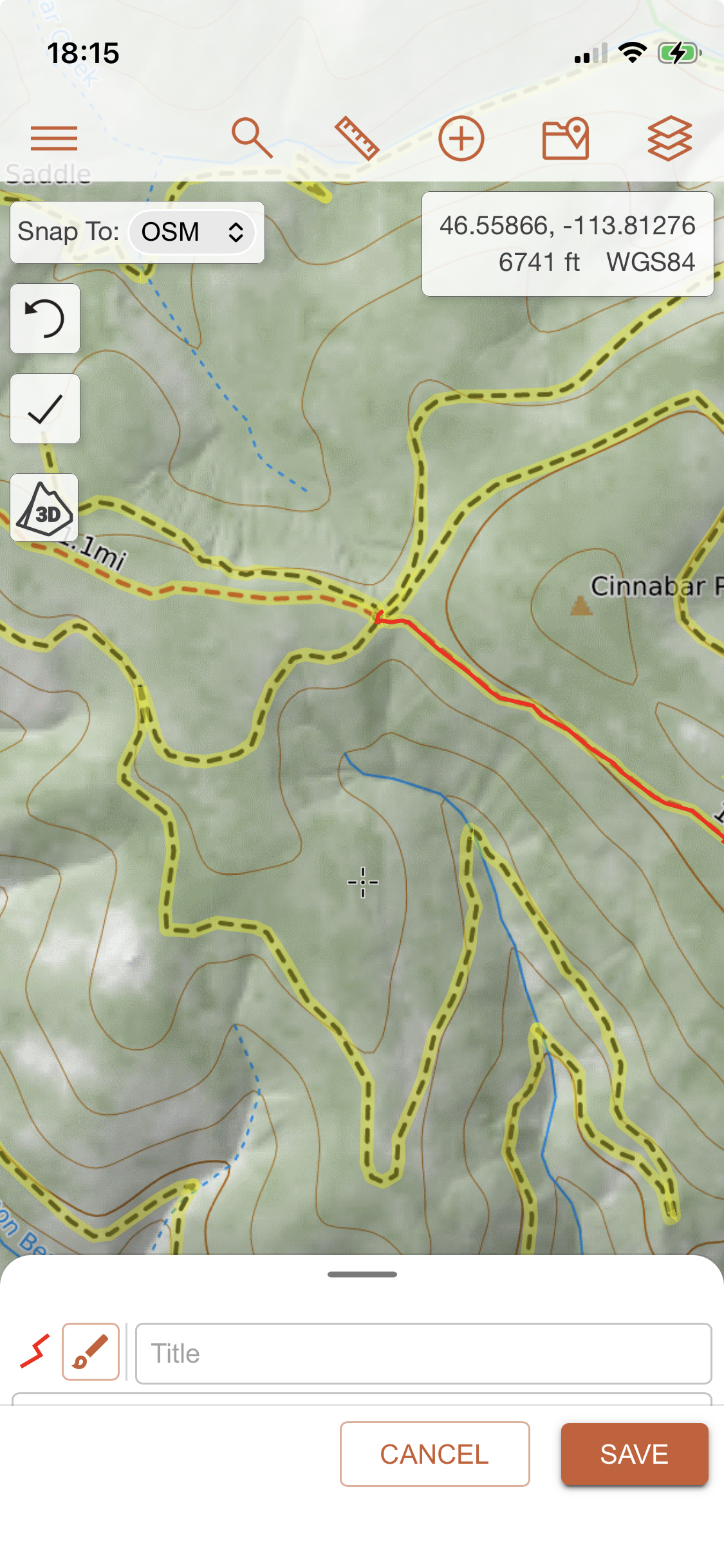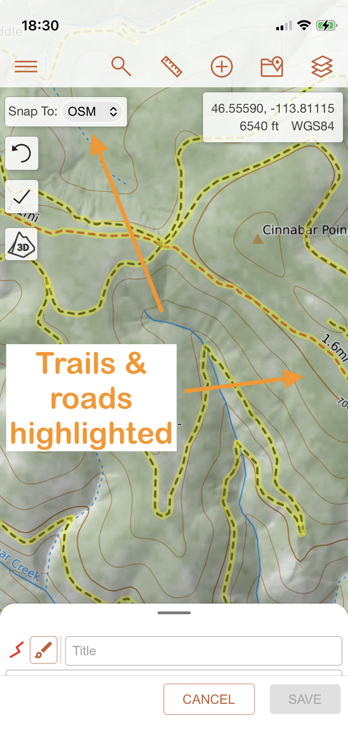 When you initiate drawing a line, you will see that there is a lot more going on than when we added just a marker. Yellow highlighting appears and indicates roads, trails or features that you can snap the line you are drawing to- we call this “snap to”. You’ll see that there is now a snap to drop down menu in the upper left hand corner. You can change what the line you are drawing is snapping to at any time from this menu.