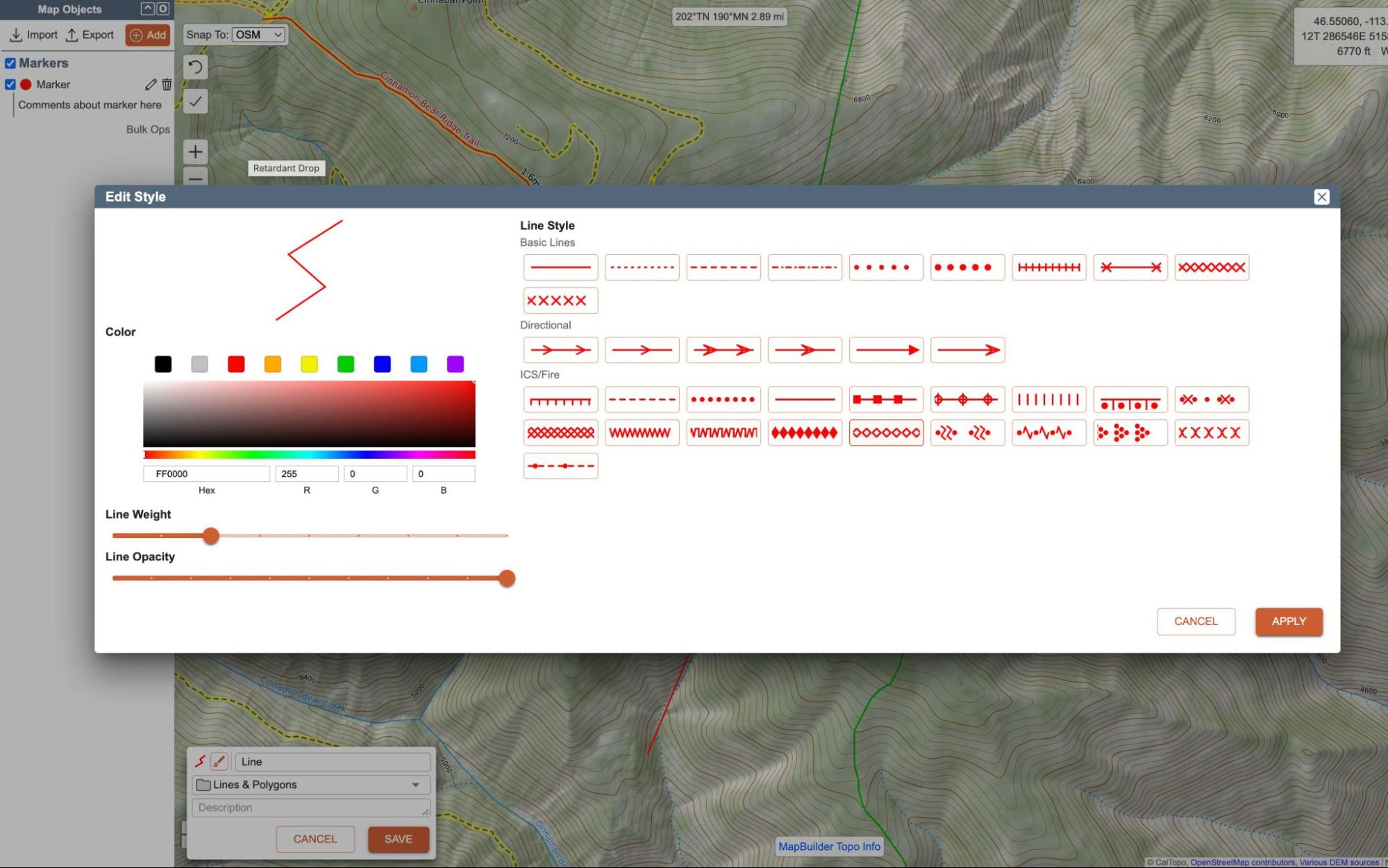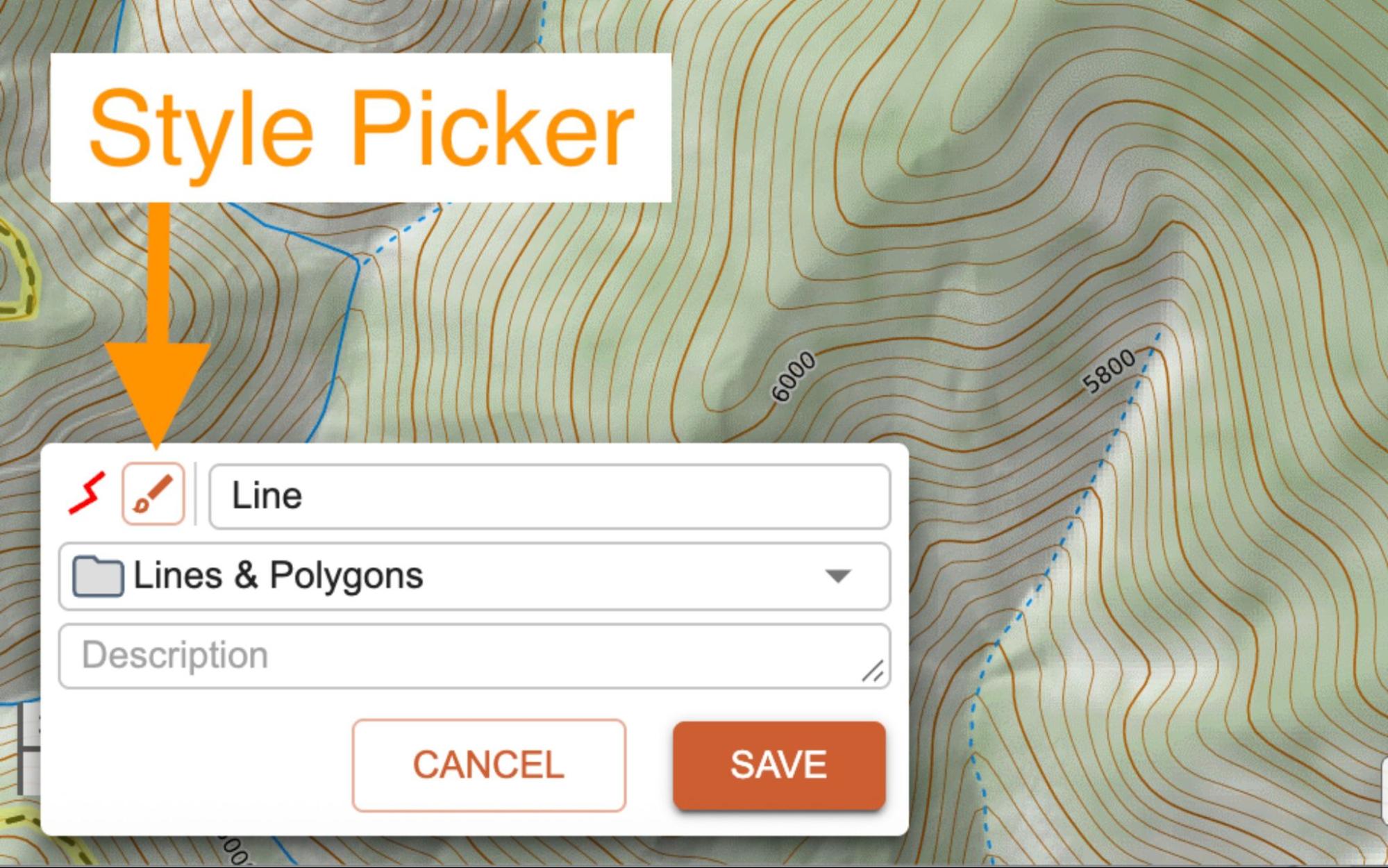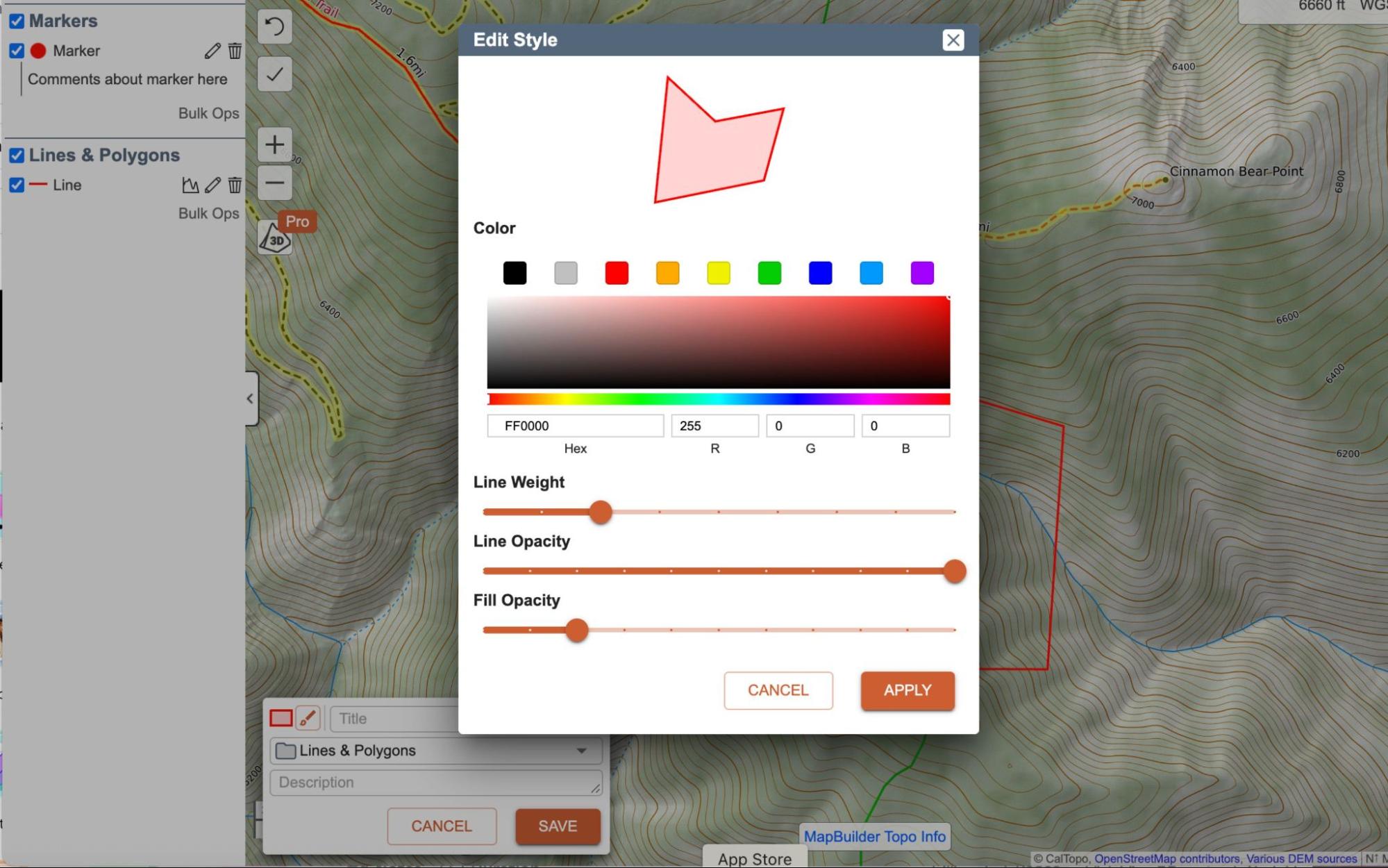 To change the style of a line, select the paintbrush icon next to the Title. This will open the Edit Style dialog (also called the Style Picker). A preview of the line’s color, weight, opacity, and style appear in the upper right. Change the line’s attributes in the relevant section as desired.