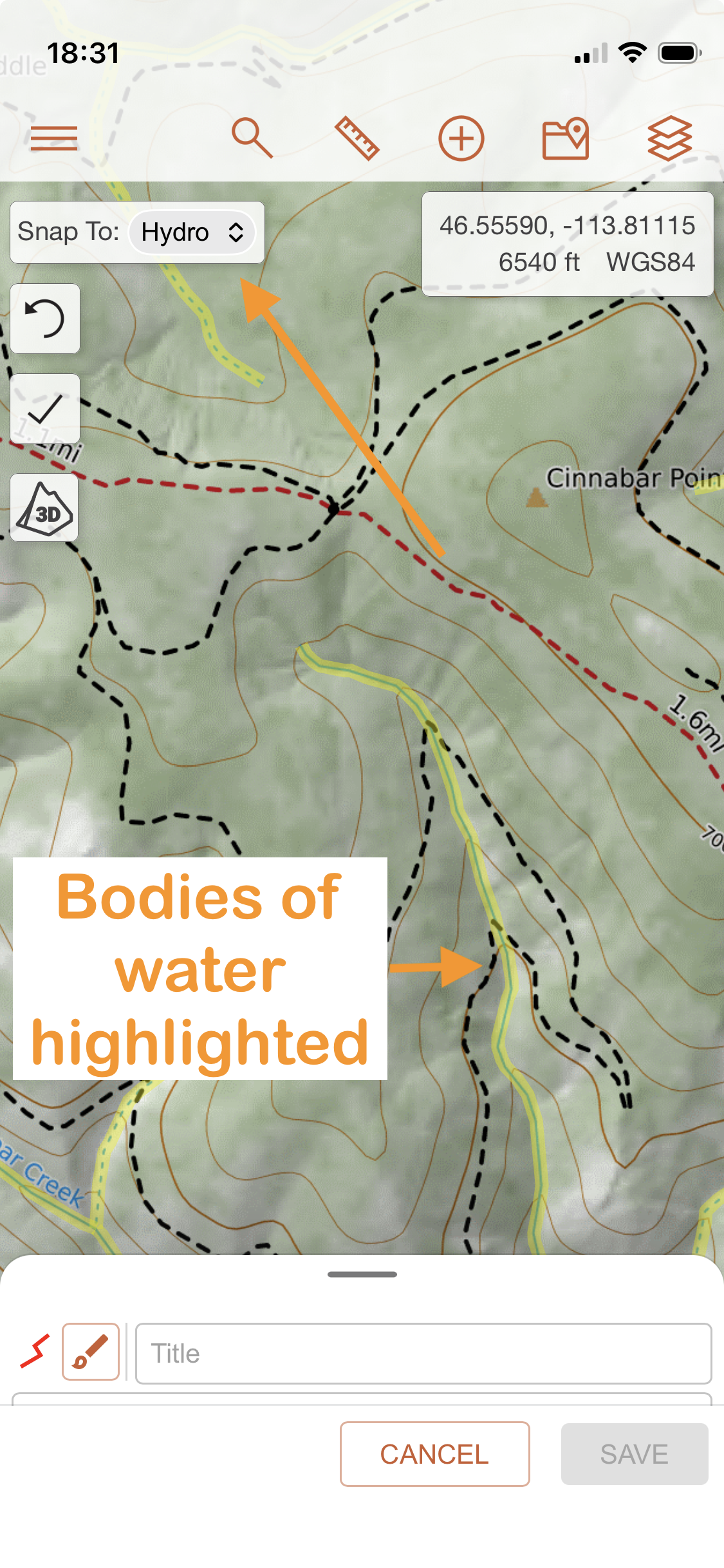 Snap to uses existing databases of geospatial data that includes tracks for trails, roads, paths, water courses and other objects. The data is divided into categories and you can choose a category to use for planning. As you will learn with map layers, not all data sets are available in all areas. If you select a snap to option and no data exists for that option in the map area you are viewing, then nothing will highlight.