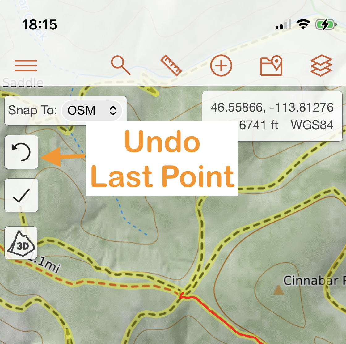 To undo points while drawing a line in the mobile app, the buttons in the upper left are the same as the buttons in the web program.