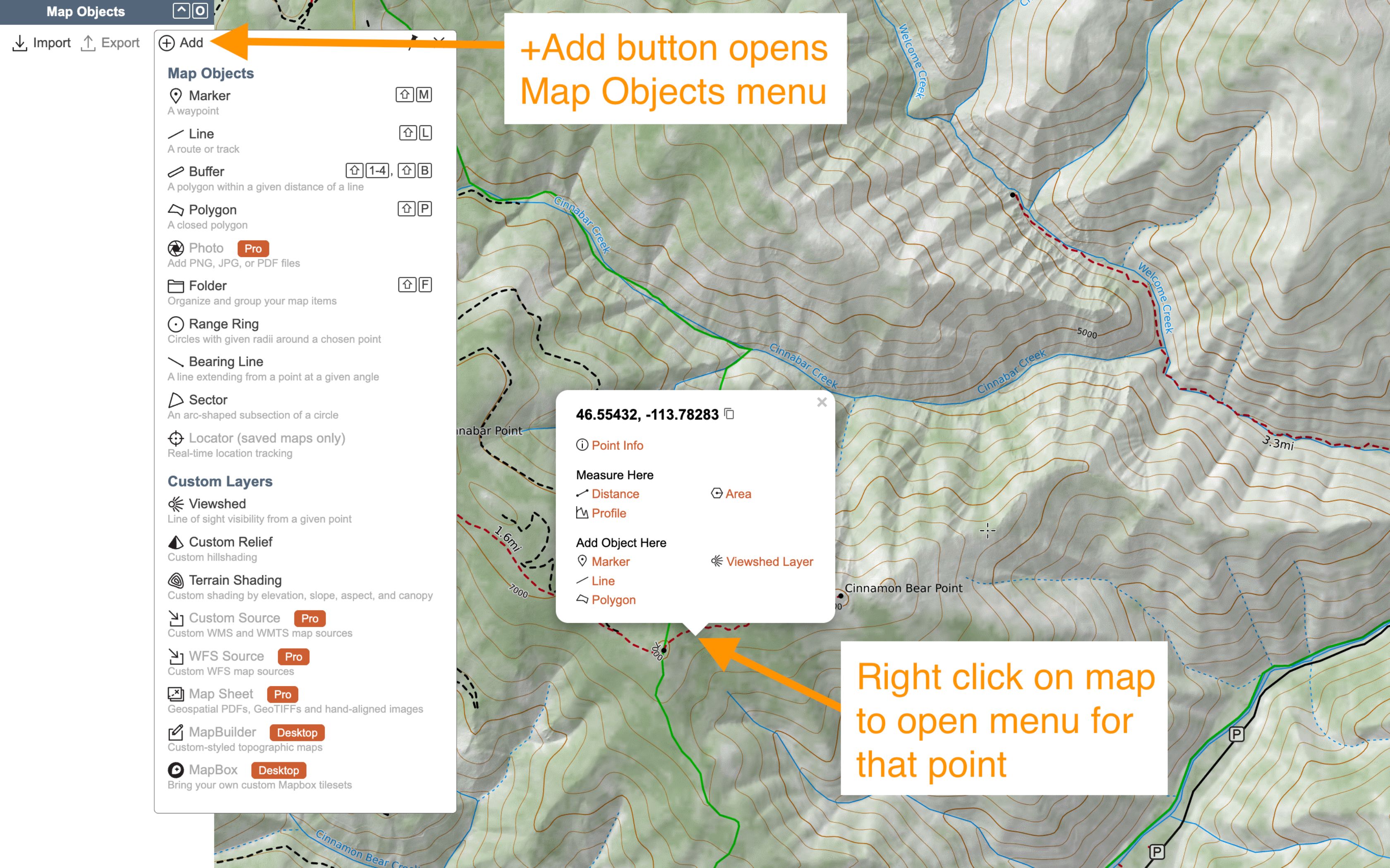There are several ways to add a marker, or most any object, to your map on the web app.