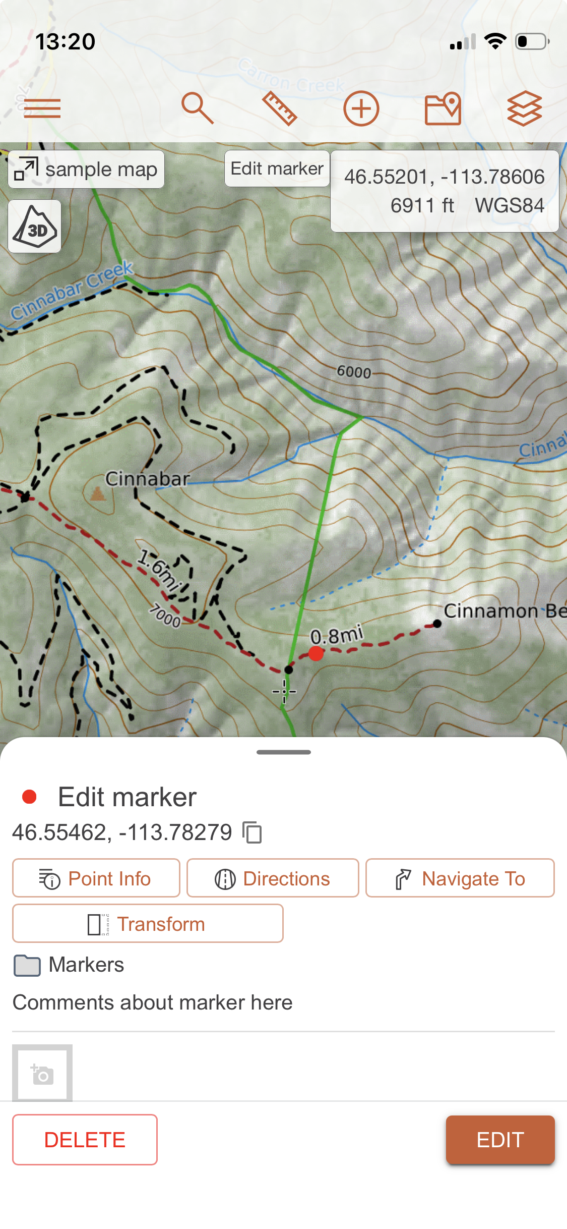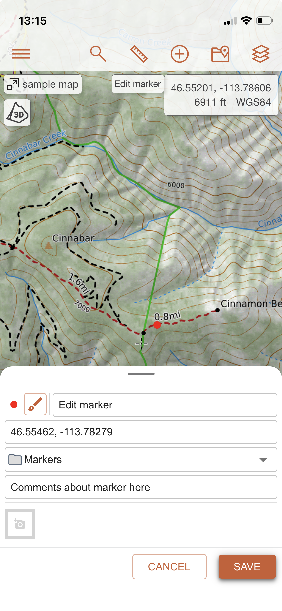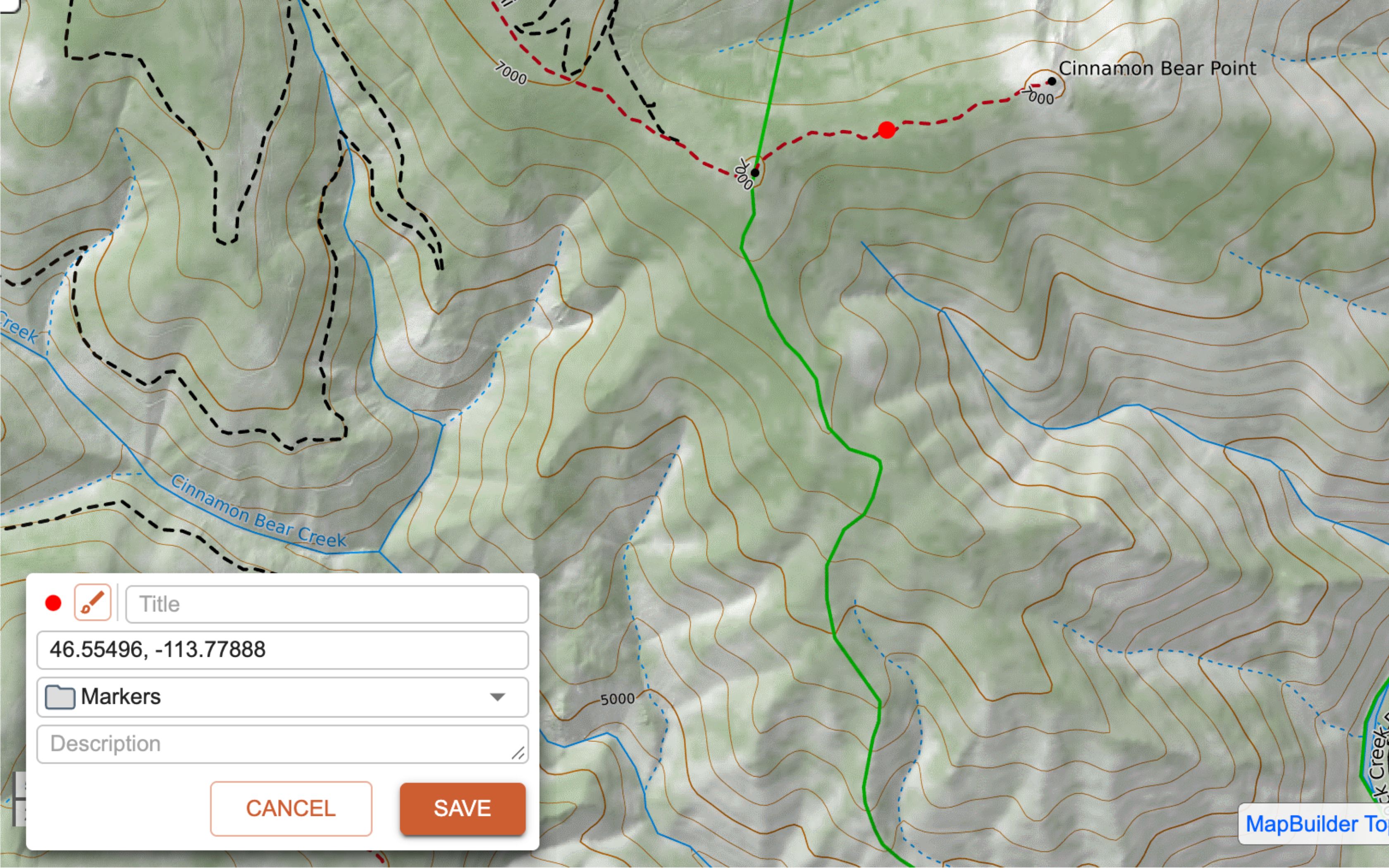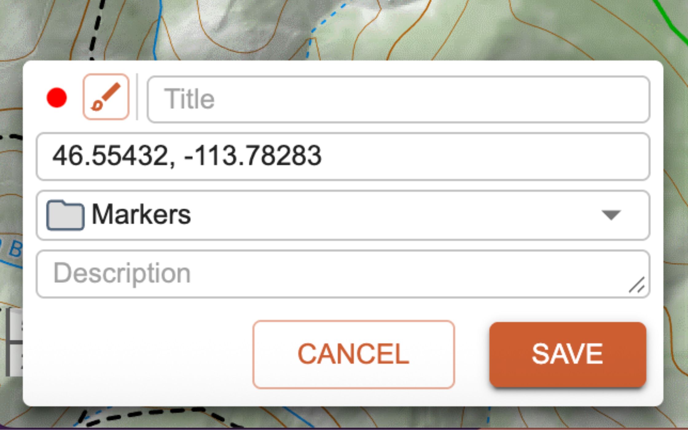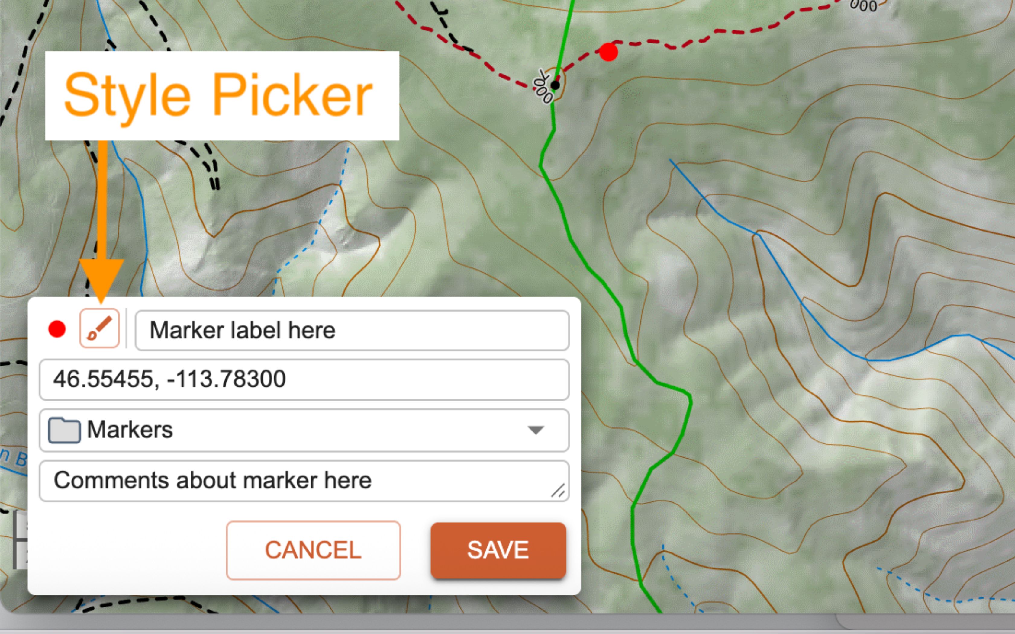 Options are as follows: marker style, title, coordinates, folder, and description. You can edit all, any, or none of the options before saving the marker. All the options can also be edited later, after creating the marker. Markers operate the same way on mobile as they do on the web or desktop program.