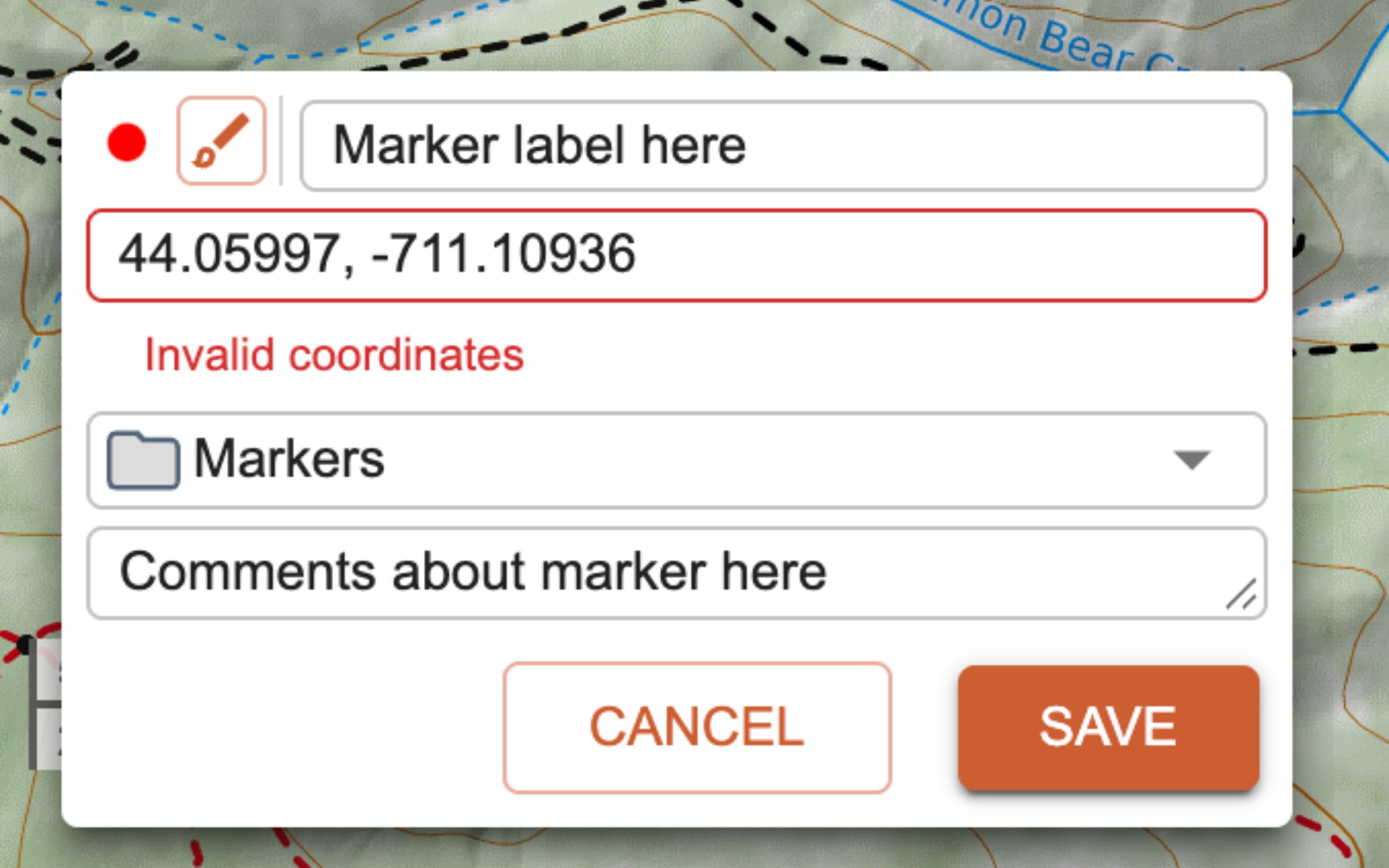 If you enter coordinates by hand (type or paste), CalTopo will confirm that the coordinates are in a valid format. f you receive an “Invalid coordinates” message,you need to fix the coordinates so that they are in a recognizable format.