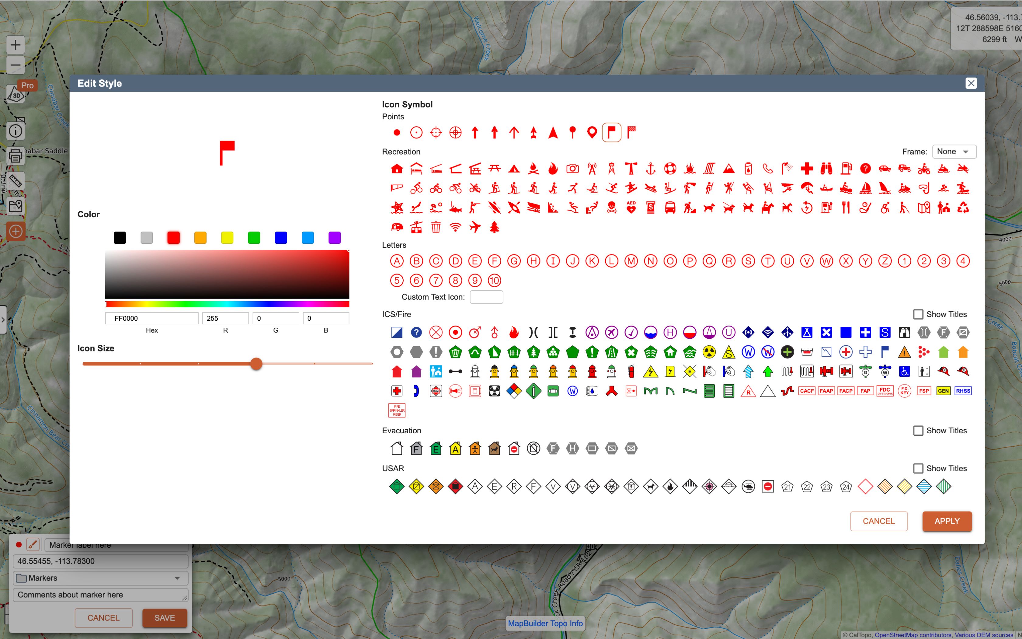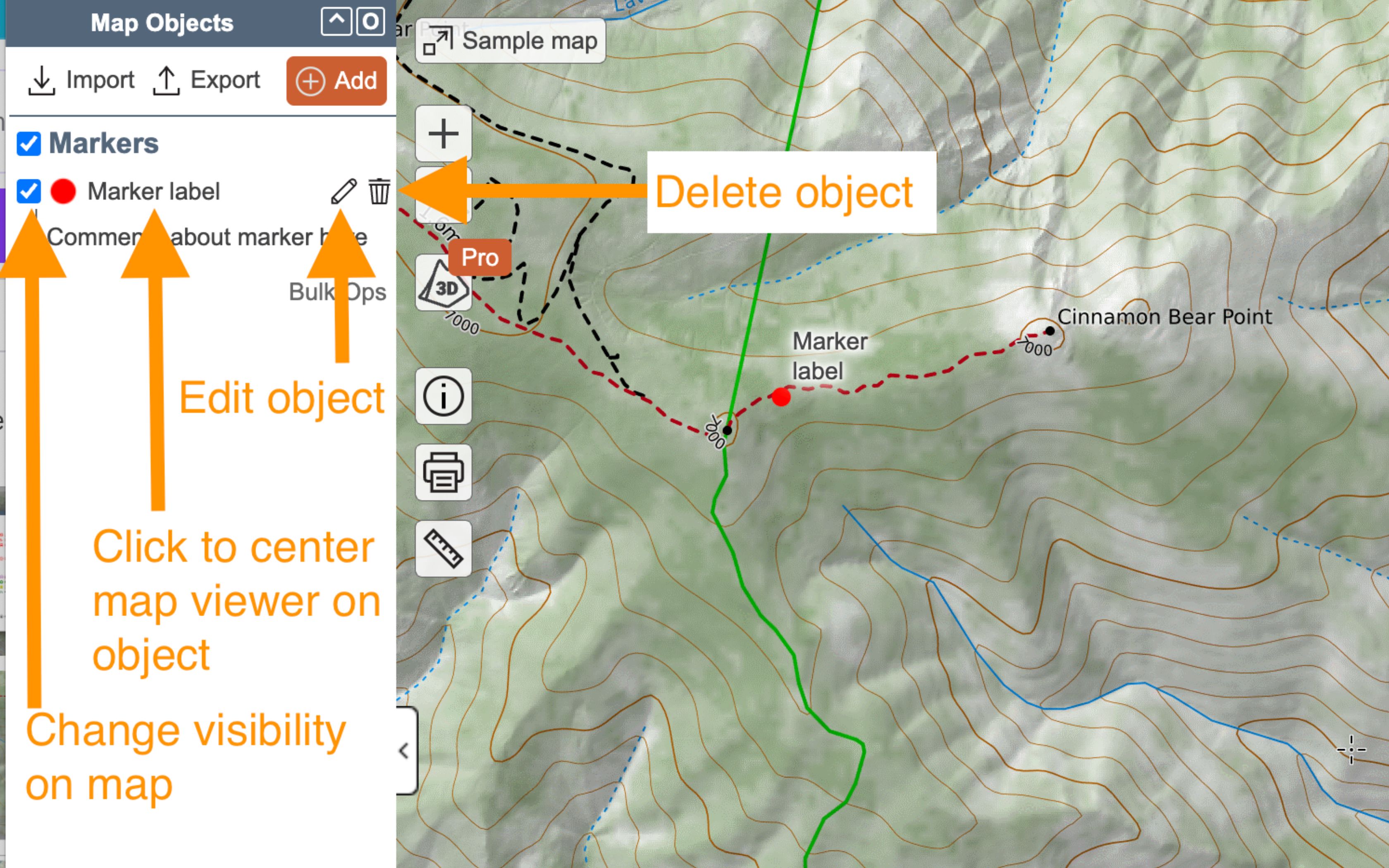After you press OK, the marker gets listed in the left-hand Map Objects column. Continue below for more info.