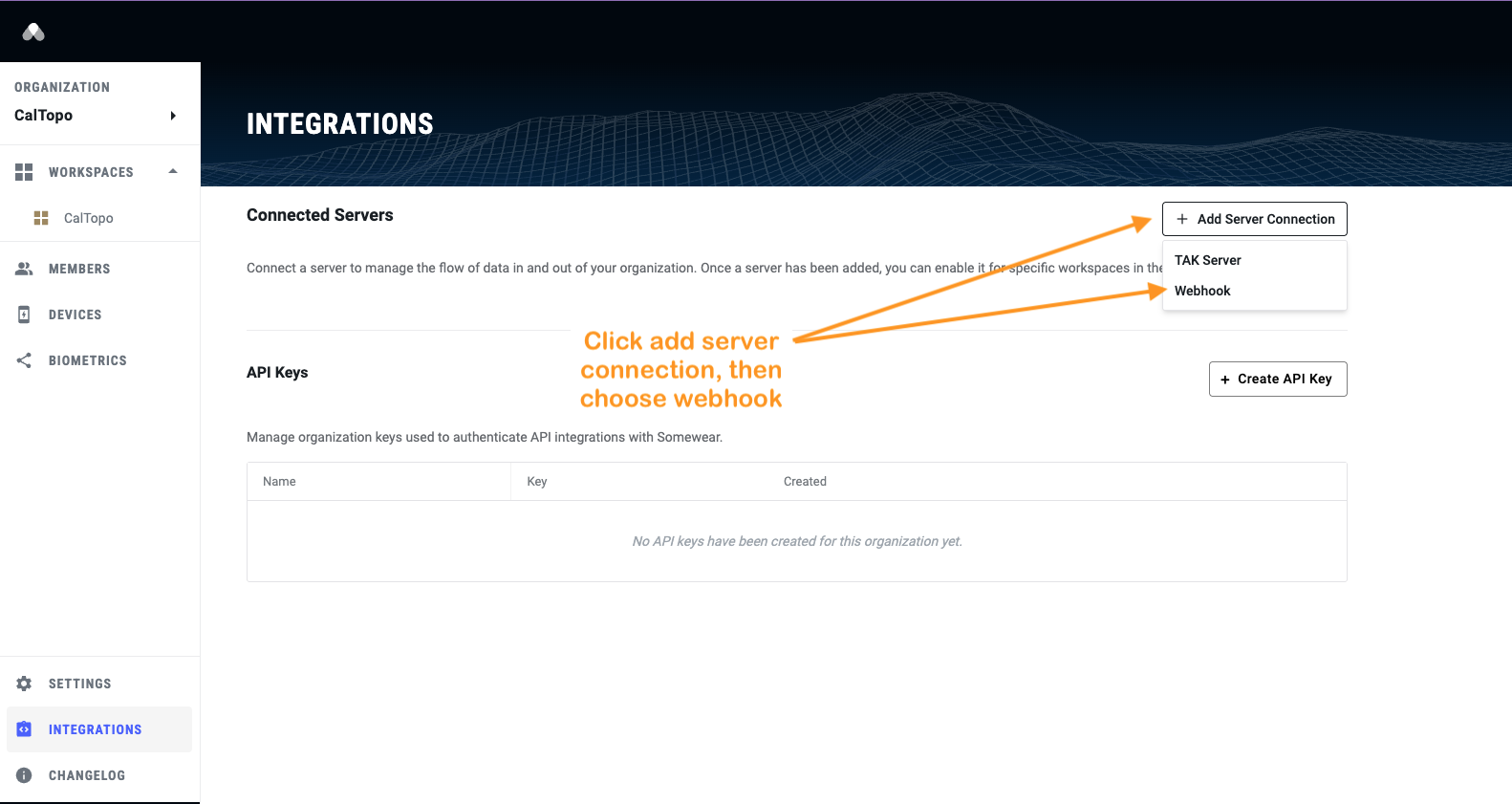 To access the Somewear webhook you need to be an ADMIN of the Somewear Workspace. When you are logged in you will see Integrations at the bottom left of the page. You will need to click that then click Add Server Connection then Webhook.