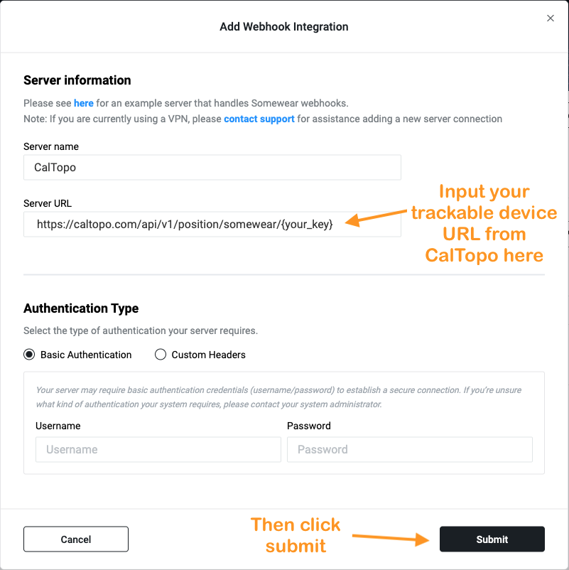 CalTopo provides integration with Somewear Workspaces. Additional details about Somewear plans can be found here on the Somewear Labs website. If your team already has a Somewear Workspace, you will use their webhook feature to integrate with CalTopo.